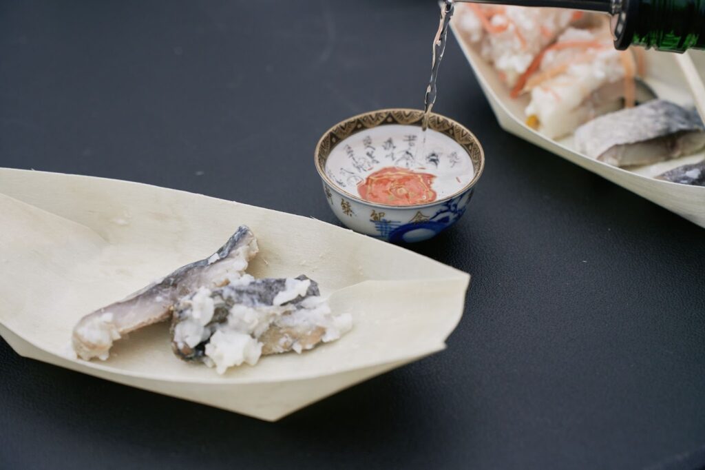 発酵由来の強い風味をもつなれずしには、純米酒や薫酒(くんしゅ)、熟成酒が向いていると池森さんは語ります。薫酒とは、米や発酵由来の華やかな香りを持つ日本酒です。これらの日本酒は、発酵したなれずしの個性的な味わいと酸味を受け止めるだけの深みとうま味を備えています。