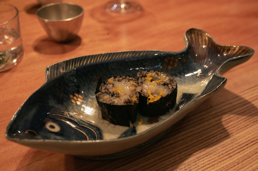 Kurozukuri is so deeply rooted in everyday life that it can be found in supermarkets, department stores, and souvenir shops throughout the prefecture. By incorporating this familiar food into sushi, rather than serving it in the usual ways, Chef Higuchi says he arrived at “a new kind of sushi roll that feels surprising, yet somehow inevitable.”