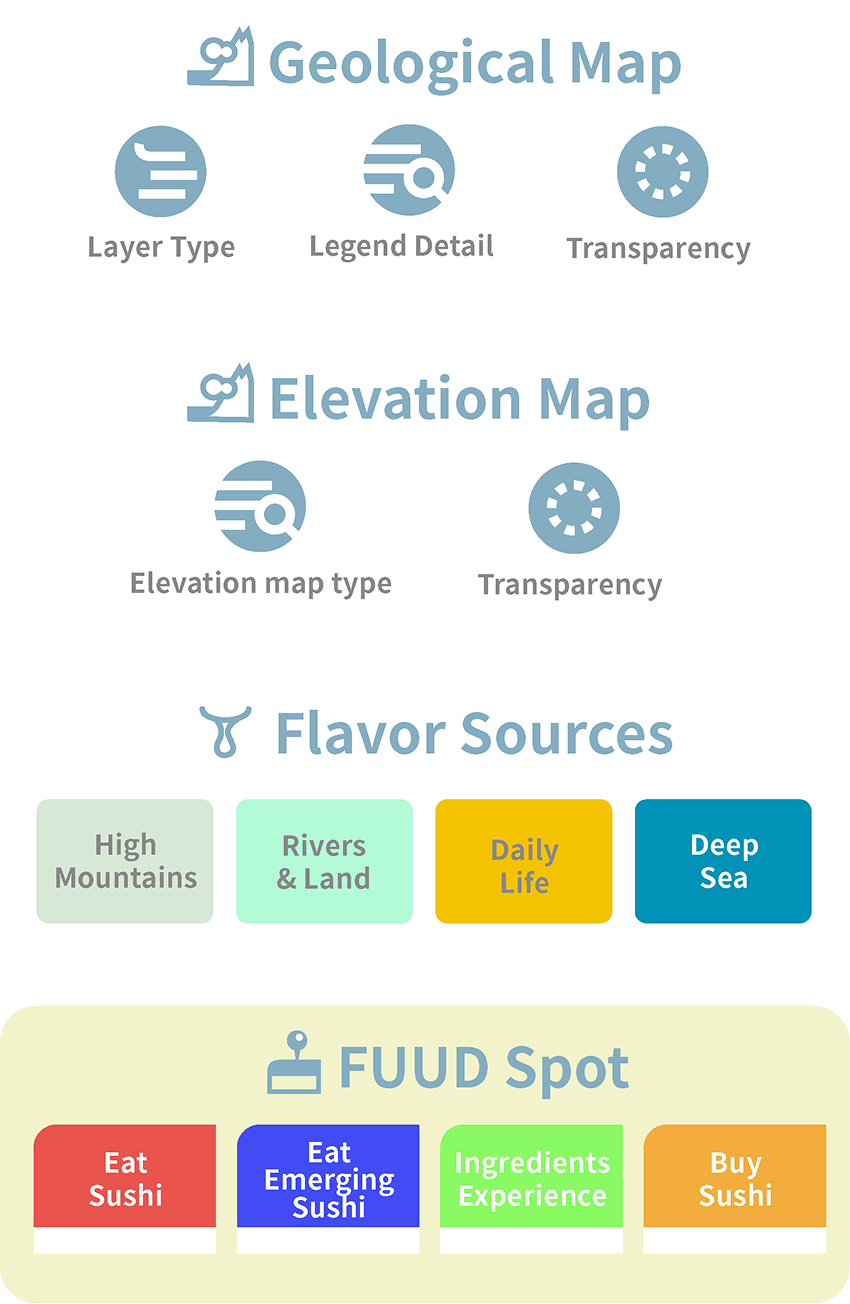 This map lets you explore sushi-related experiences alongside visualized data of Toyama’s dramatic 4,000-meter (13,000-foot) elevation landscape. Use the Control Menu to discover geo-content and local spots, guided by evolving Empathy Scores based on user ratings.