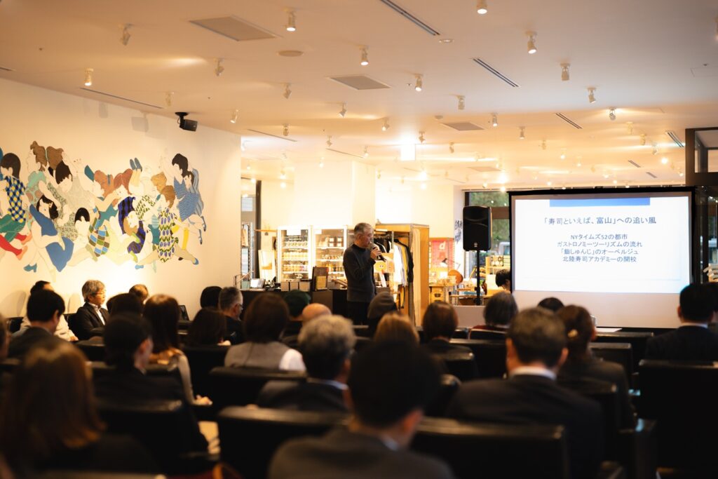 Hiroyuki Akashi, a producer at Shiawase Design, followed with a look at how Toyama is using food culture, especially sushi, as a driver for tourism and regional branding. About 60 people, including government officials, chefs and tourism professionals, attended.
