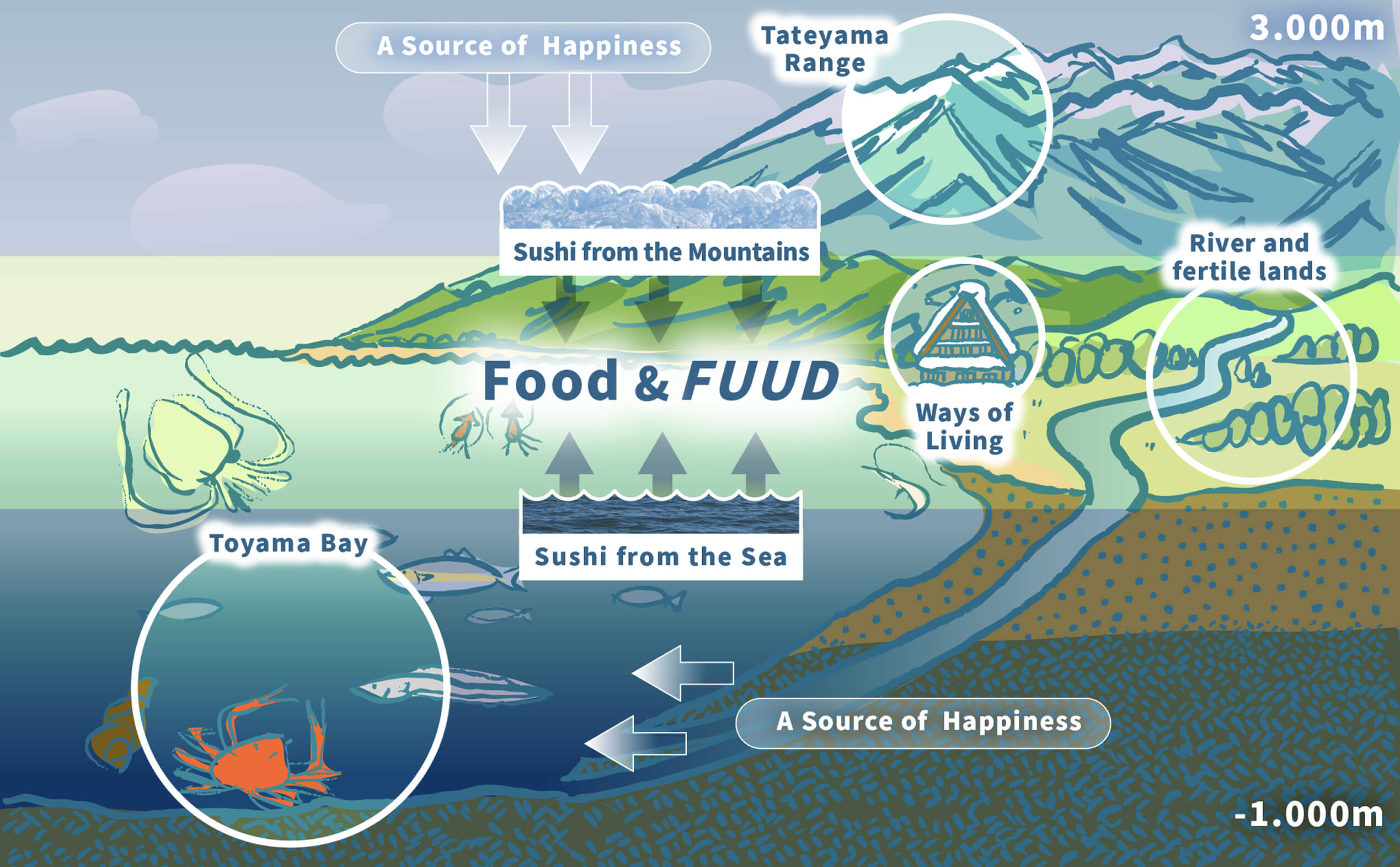 This 4,000-meter (13,000-foot) elevation difference creates a grand water circulation system. Snowfall on the Tateyama Range and Hida Highlands melts and nourishes Toyama’s lush forests, forming extensive alluvial fans that carry nutrients into the sea.